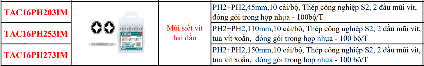 TOTAL, một thương hiệu tập trung vào việc cung cấp các công cụ chất lượng hàng đầu với giá cả phải chăng, tự hào giới thiệu Bộ 10 mũi siết vít bake 2 đầu 45mm-110mm-150mm TOTAL - một lựa chọn xuất sắc cho nhu cầu công việc của bạn. So với các thương hiệu nổi tiếng như Bosch, Makita và Stanley, sản phẩm của TOTAL không chỉ đáng tin cậy mà còn mang lại sự tiết kiệm cho người dùng.