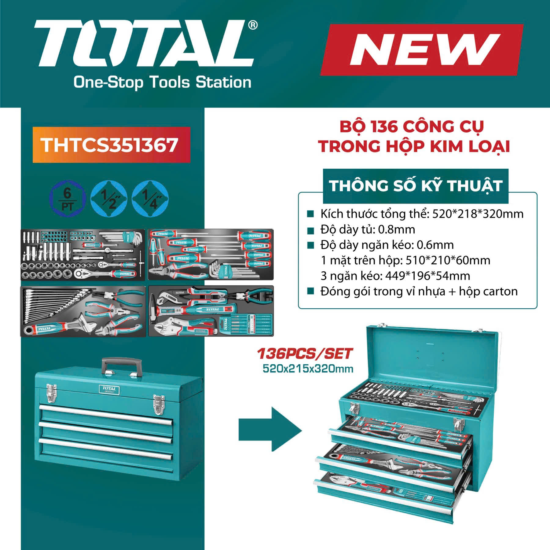 Bộ 136 công cụ trong hộp kim loại Total THTCS351367