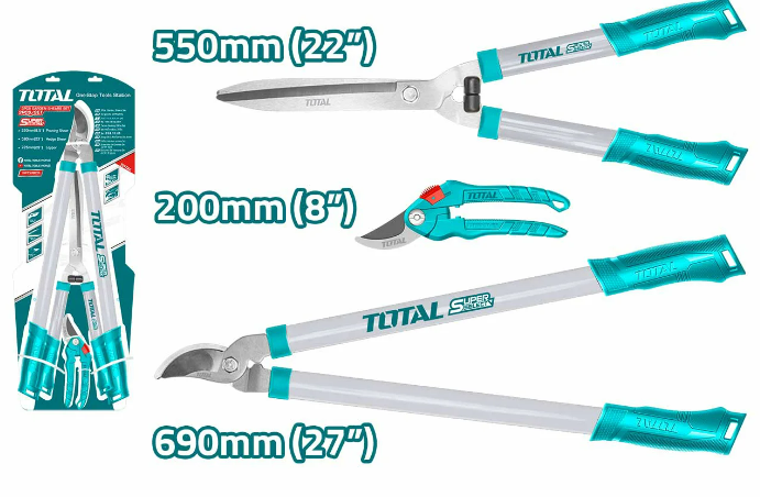 | Thành phần bộ | Kéo tỉa hàng rào 550mm, Kéo cắt cành lớn 700mm, Kéo tỉa cành nhỏ 200mm |
