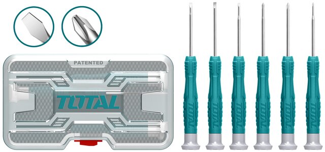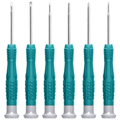 - Bộ 6 tua vít đồng với tay cầm TOTAL thiết kế mới, hộp nhựa mới