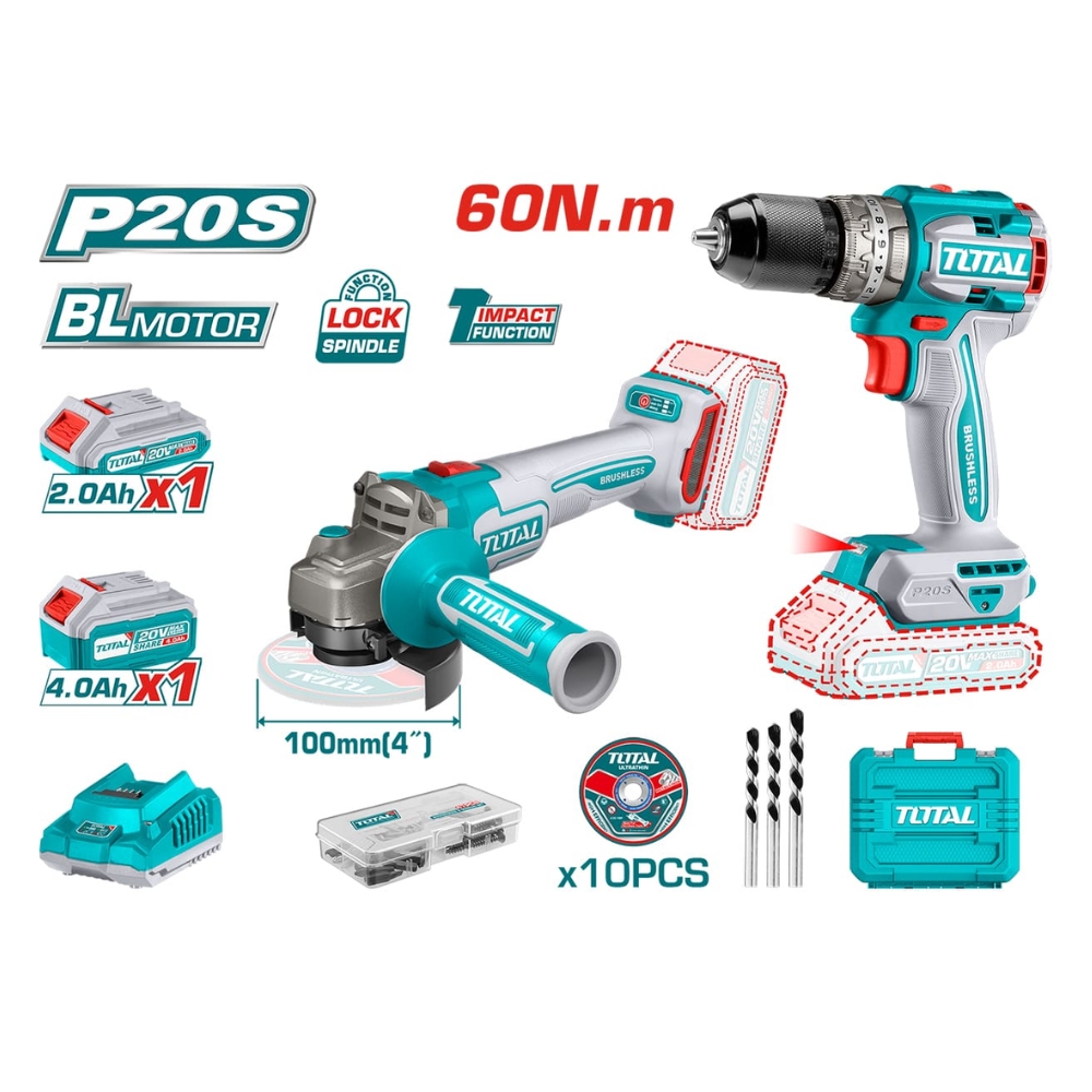 - Bộ combo: Máy mài góc TAGLI21104 & Máy khoan búa TIDLI20602 không chổi than, dùng pin 20V