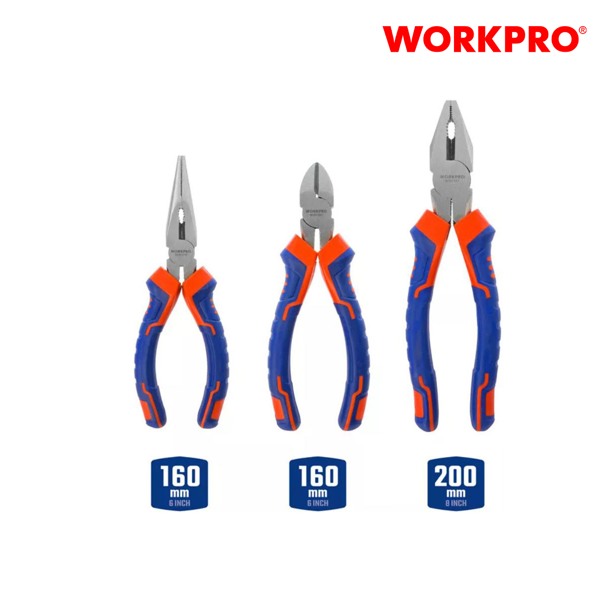 Bộ kìm 3 món gồm (điện, cắt, nhọn) 6 inch và 8 inch Workpro- WP201007 là một bộ kìm đa năng đáng chú ý, được thiết kế để đáp ứng nhu cầu của các kỹ thuật viên, thợ điện và các ngành công nghiệp khác. Với chất lượng chắc chắn và thiết kế tiện dụng, bộ kìm này mang lại sự linh hoạt và hiệu suất cao trong nhiều tác vụ khác nhau.