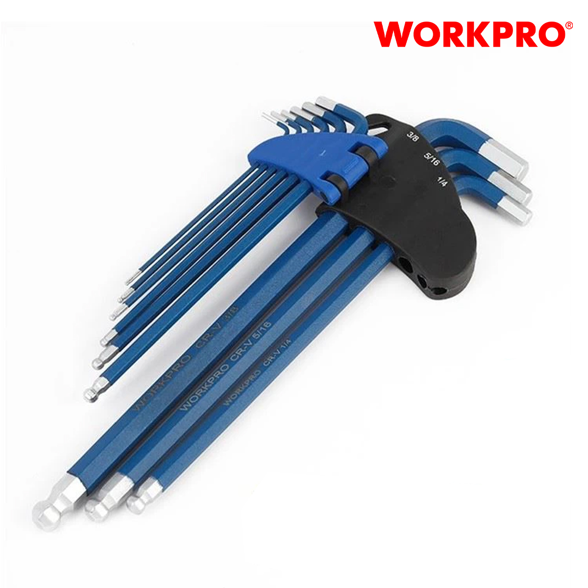 Bộ lục giác đầu bi kiểu L, 9 cái hệ mét (1.5,2,2.5,3,4,5,6,8,10mm) thép hợp kim CR-V Workpro - WP222011 là một bộ công cụ chất lượng cao được thiết kế để đáp ứng các nhu cầu của bạn trong công việc và sửa chữa. Với các đặc điểm nổi bật, thông số kỹ thuật ấn tượng và tính năng tiện dụng, sản phẩm này sẽ là một trợ thủ đáng tin cậy cho các tác vụ lục giác đầu bi.