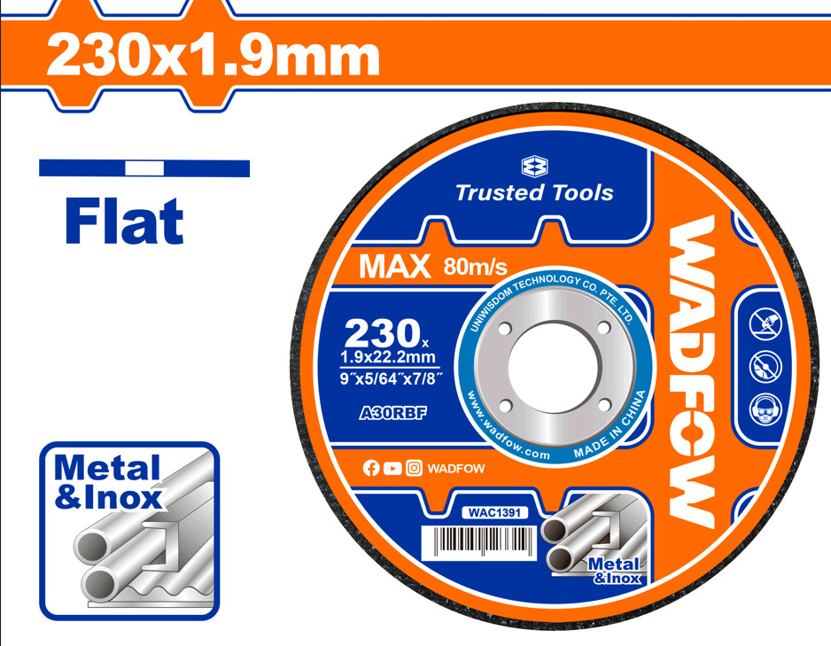 Với kích thước 230mm (9 inch) x 1.9mm (5/64 inch) x 22.2mm (7/8 inch), đá cắt WadFow WAC1391 được thiết kế vừa vặn để đảm bảo cắt chính xác và nhanh chóng.
