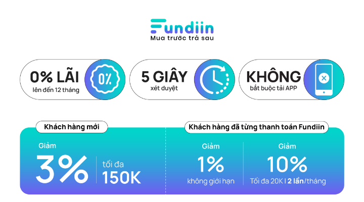 - Hưởng chính sách 0% lãi suất theo điều kiện của Fundiin.