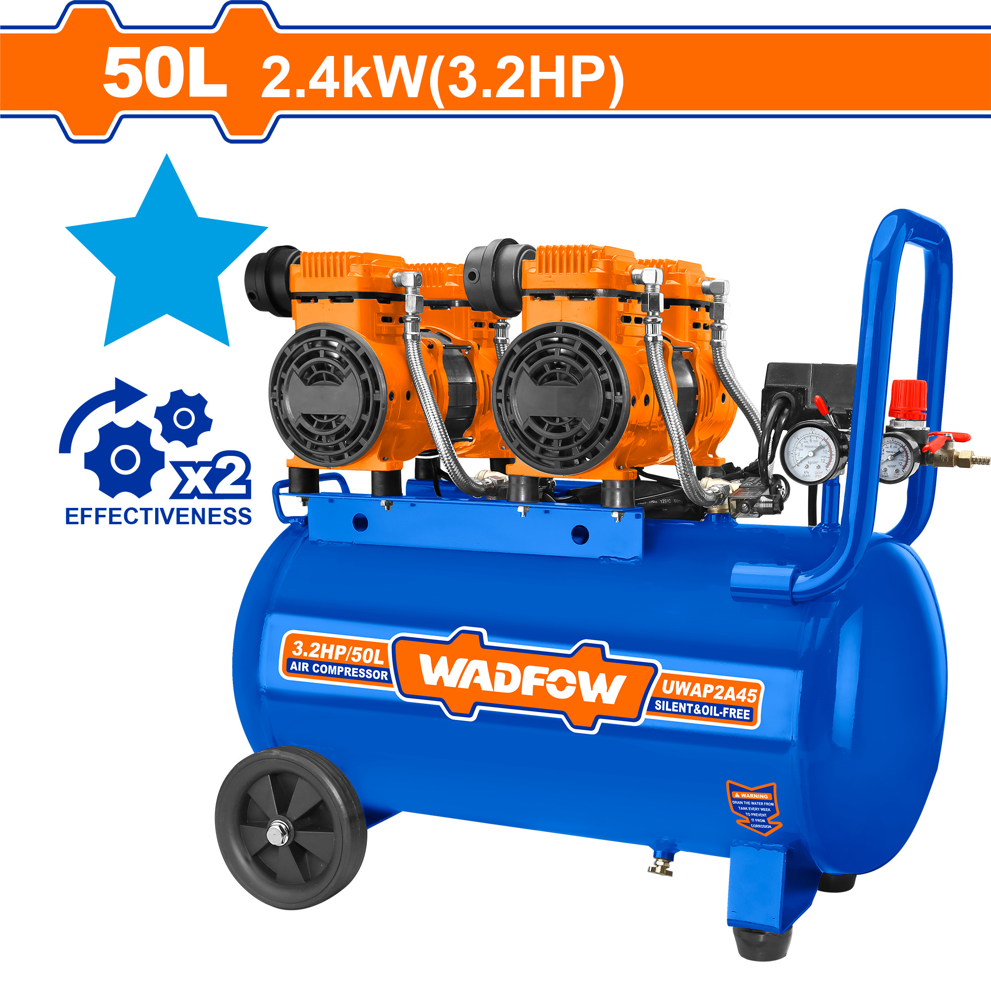 Máy nén khí không dầu 2400W-50L WadFow WAP2A45 kết hợp sức mạnh kép từ hai động cơ 1200W (3.2HP) và dung tích bình chứa lớn 50L (13.2Gal), mang lại hiệu suất cao và đáng tin cậy trong mọi tác vụ nén khí.