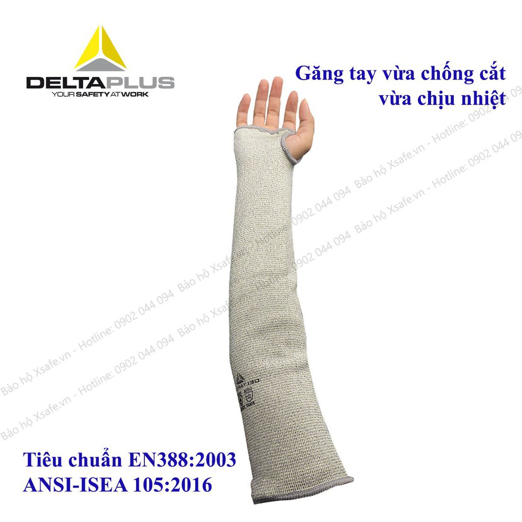- Một ưu điểm khác của sản phẩm là có thể tiếp xúc với vật dụng ở nhiệt độ khá cao. Đặc điểm này được thể hiện thông qua chứng nhận EN407 X1XXXX: nghĩa là sản phẩm đã vượt qua bài test tiếp xúc với vật dụng ở nhiệt độ 100 độ C trong 15 giây. Với ưu điểm này thì chúng ta có thể kết hợp sản phẩm này với găng tay bảo hộ chịu nhiệt Delta plus VENICUT52 để tạo thành combo ống tay + găng tay vừa bảo hộ vừa chịu nhiệt.