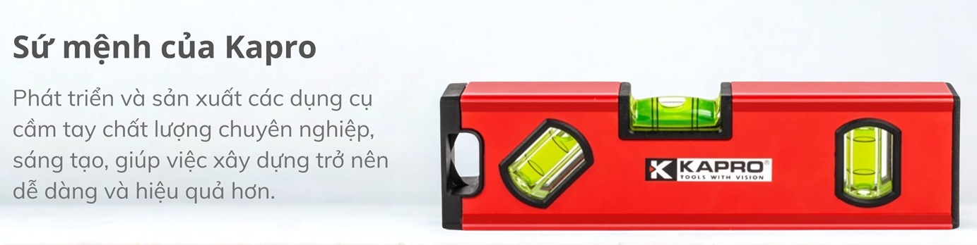 Kapro là thương hiệu thiết bị đo lường chuyên nghiệp đến từ Israel, nổi tiếng với độ chính xác cao và độ bền vượt trội trước công trường khắc nghiệt. Sản phẩm được tích hợp các giải pháp kỹ thuật giúp thợ thi công đo nhanh – đọc rõ – sai số thấp. Ống thủy có độ phóng đại lớn, tương phản tốt, thân nhôm cứng chống cong vênh, độ hoàn thiện cao. Nhiều sản phẩm của Kapro đạt chứng nhận chất lượng VPA danh giá của Đức; đồng thời, tất cả sản phẩm laser và điện tử đều được chứng nhận FDA và CE, tuân thủ các quy định RoHS, WEEE và REACH, với hệ thống nhà máy sản xuất đáp ứng đầy đủ các tiêu chuẩn ISO 9001, ISO 14001 và SA8000.