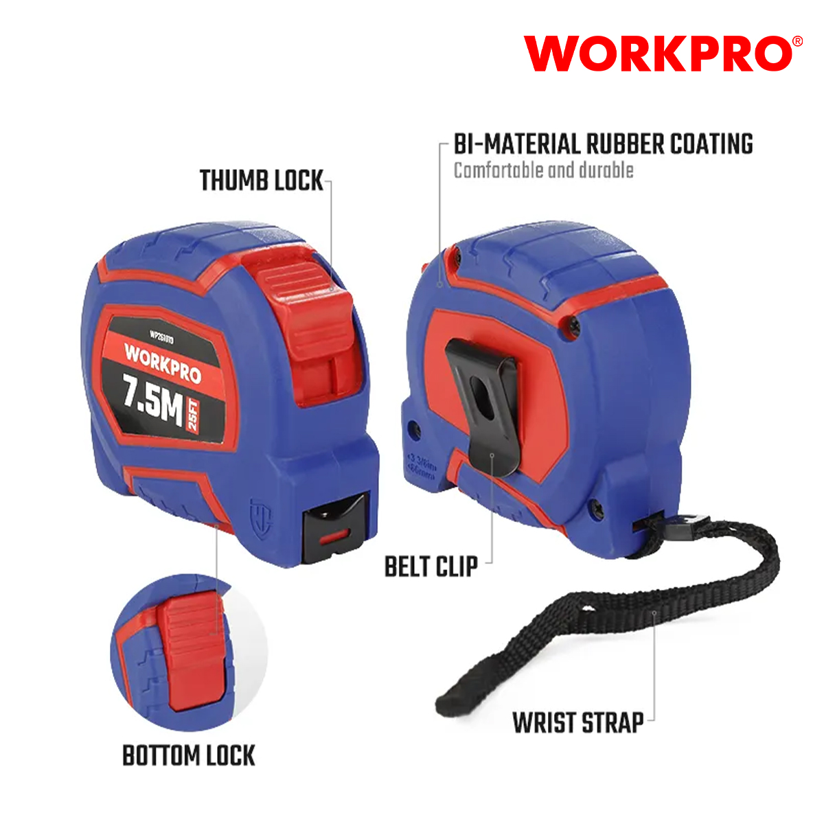 Thước cuộn tráng nylon, kích thước 7.5Mx25mm Workpro - WP261010 là một công cụ đa chức năng và đáng tin cậy trong lĩnh vực đo đạc và xây dựng. Với thiết kế chắc chắn và chất liệu thép cao cấp, sản phẩm này mang lại sự đáng tin cậy và bền bỉ trong quá trình sử dụng.